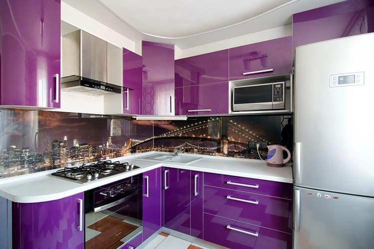Фартук – практичный и просто красивый выбор. Материалы – стекло либо плитка.